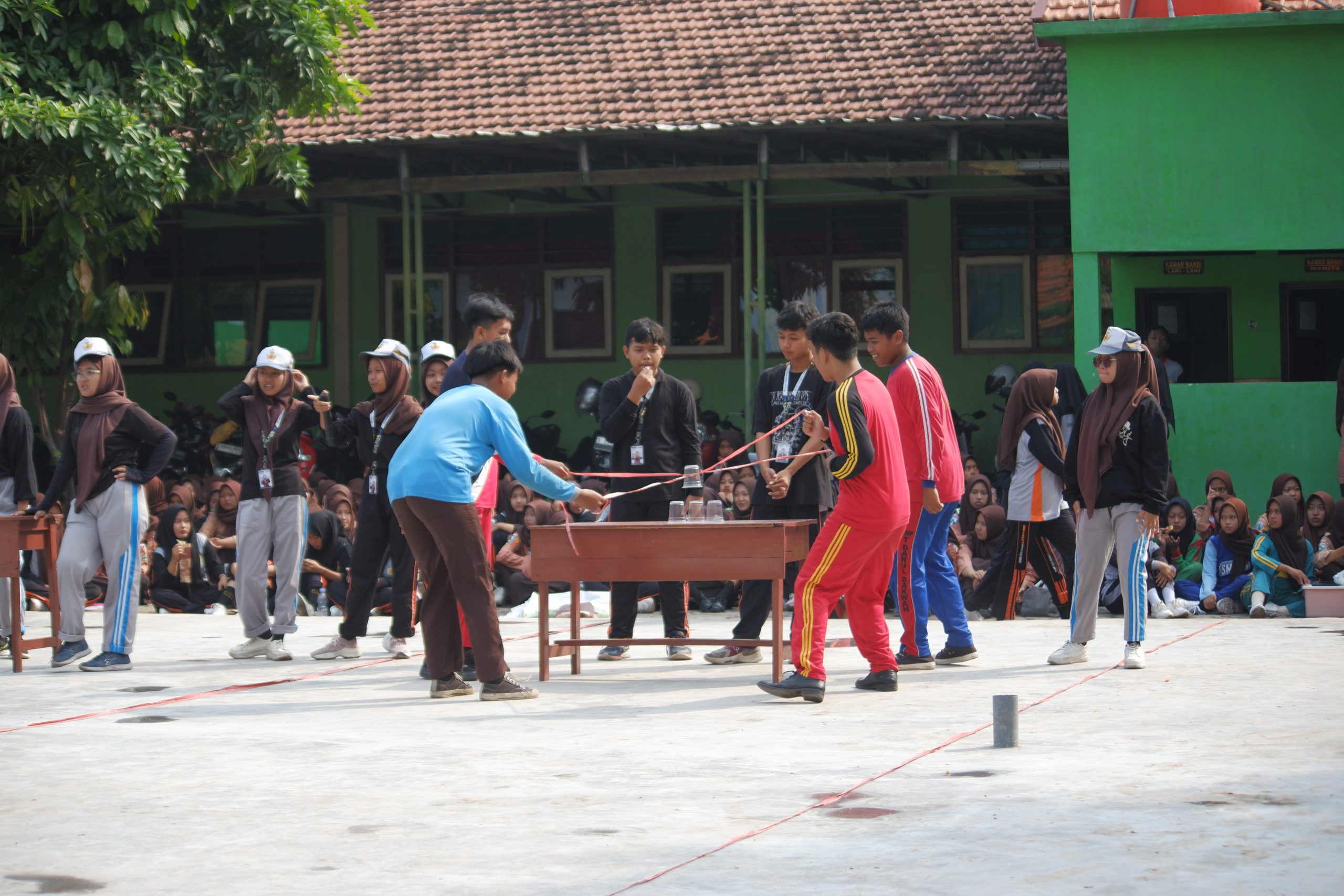 Dalam pelaksanaannya, setiap kelas mengirimkan empat orang sebagai perwakilan tim. Masing-masing peserta memegang ujung tali rafia yang terhubung pada sebuah karet di bagian tengah. Alat sederhana tersebut digunakan untuk mengambil dan menyusun gelas plastik satu per satu hingga membentuk piramida, terdiri dari tiga gelas di barisan bawah, dua gelas di barisan tengah, dan satu gelas di bagian atas. Seluruh proses harus dilakukan tanpa menyentuh gelas dengan tangan; jika ada peserta yang melanggar aturan ini, maka tim akan langsung didiskualifikasi.